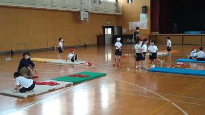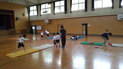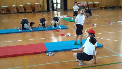 曲に合わせた動きの練習をしています。曲はどのグループも同じ「人間っていいな」です。歌詞を口ずさみながらどんな動きにするか動作も入れながら練習しています。