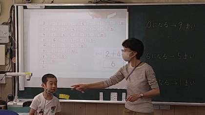 たした答えが斜めで同じになっていることやたての並びで1ずつ増えていることなどを前に出て説明しています。