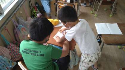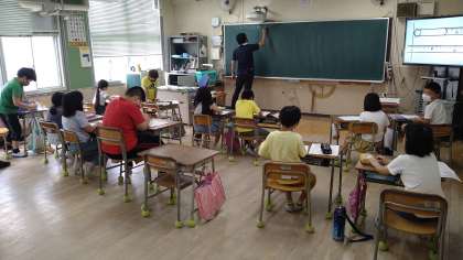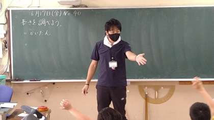 学習の初めにドリルでメジャーの使い方を確認しています。前回の学習で「メジャーを使って測りたい長さはどこかな。」の問いに対して、子どもたちが答えた場所の確認をしています。このあと3か所の長さを測りに行きます。