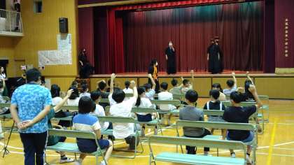 そのあと約1kgの重さがある模造刀を使って数名の児童と1名の指導者に殺陣の体験をさせていただきました。最後に質疑応答でさまざまなことを教えていただきました。