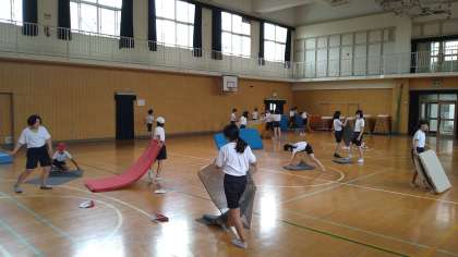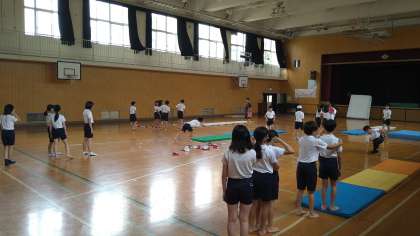 今週からプール水泳が始まるので、一応今日が単元最後の時間となっています。3つの連続技の到達度合を確認しています。子どもたちからは、プール水泳を楽しみにしている声も聞こえてきました。