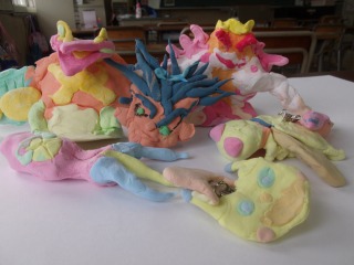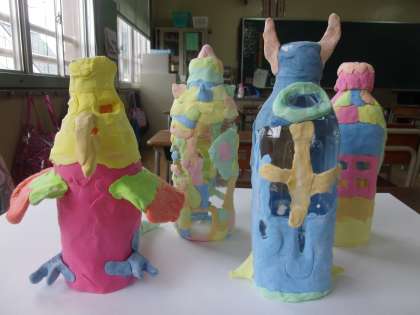 ペットボトルに紙ねん土をつけて、ランプシェードを作りました。エッグライトで7色に光ってとてもきれいでした。残ったねん土でキーホルダーを作りました。