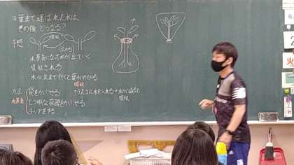 子どもたちは、「水蒸気になって出ていく」「吸収される」「水が先までいくと葉が伸びる」と予想しています。観察方法として、「袋をかぶせる」「透明な容器をかぶせる」「ラップをかける」があがっています。