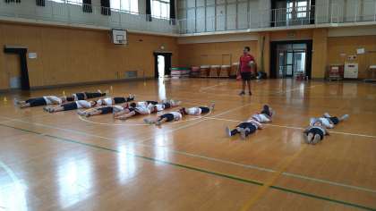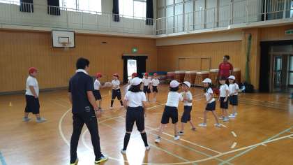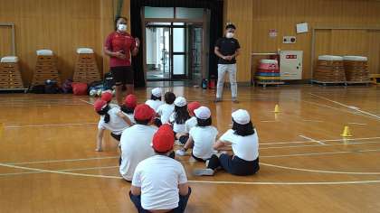 基本的な動きを身につける遊びや楕円球を使ったドリブル、手渡しリレーなどを楽しみました。