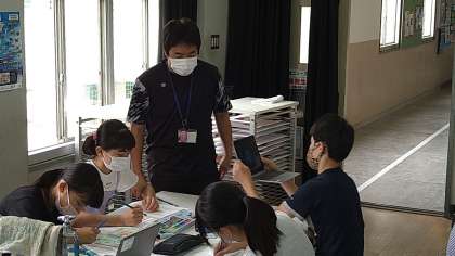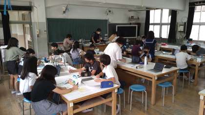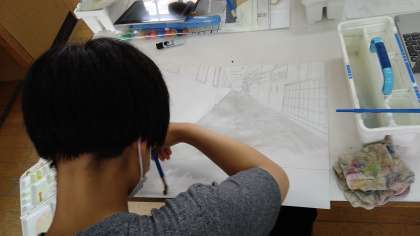 「一点透視図法」を活用してかいています。もとの風景(廊下)はタブレット端末のカメラ機能を使い、写真を撮っています。奥行きの感じられる絵になっています。