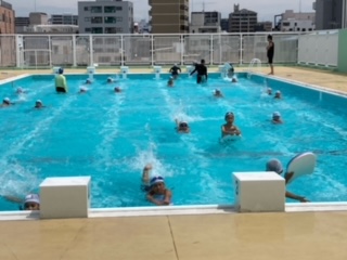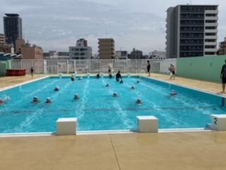 中学年は先週から始まっていますが、今日は縦のコースを使ってバタ足の練習をしています。
