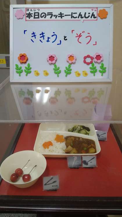 今日はデザートにさくらんぼが提供されています。さくらんぼは、山形県産のものです。