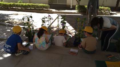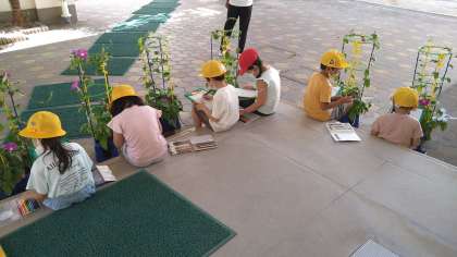 連日の猛暑によりアサガオは少し元気がありません。観察する前に子どもたちはペットボトルに水を入れアサガオにあげています。水をあげた子どもたちからアサガオの花を色えんぴつでかいています。
