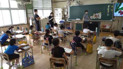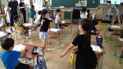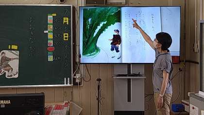 おじいさん役(5人)、おばあさん役(指導者)、孫役(4人)、犬役(4人)に分かれて役割読みを動作をつけておこなっています。次に犬が猫を呼びに行く場面について考えています。