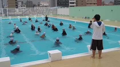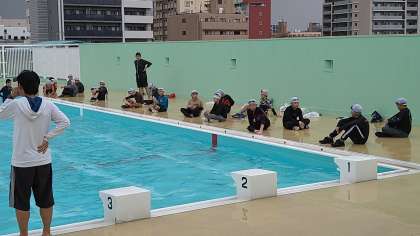 換水(プールの水の入れ替え)のタイミングにあわせて「着衣泳」をおこなっています。