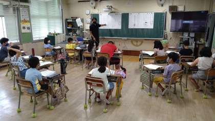 「朝ごはんをしっかり食べよう」という同じ題名の2つの文章を読み比べています。子どもたちは文章中の展開の違和感に気づいて盛りあがっています。