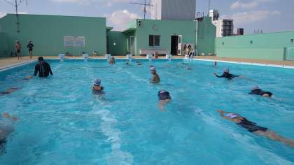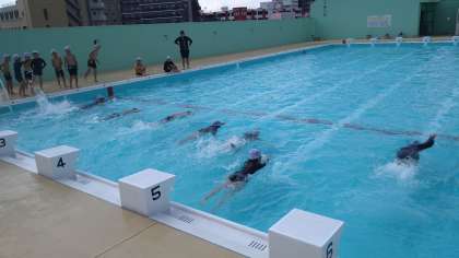 今日は、現時点でどれくらい泳げるかを測っています。夏休みの水泳特別練習を、ご案内させていただく指標となります。また、お子さまや来週からの懇談会で連絡させていただきます。なお、基準となる距離はございますが、超えていても声をかけさせていただくこともございます。