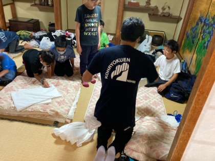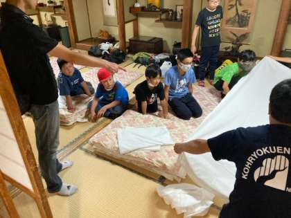 キャンプファイヤーから帰ってきて、シーツの敷き方のレクチャーを受けてます。
