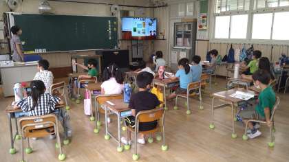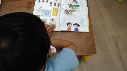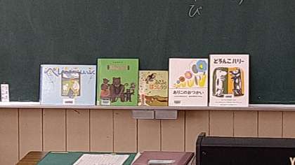 絵本の「おおきなかふ」の読み聞かせをおこなっています。そのあと、教科書で紹介されている絵本について説明しています。なんと紹介されている5冊、すべて教室にありました。