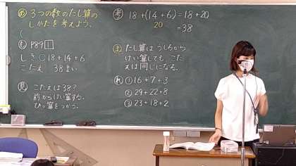 「3つの数のたし算のしかたを考えよう」をめあてに学習を進めています。