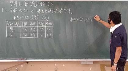 本の貸し出した数を調べる問題です。単元の最後に身の回りのことを調べて、表にまとめたり、グラフに表したりする問題の1つに取り組んでいます。そこから派生する問題を想像させています。