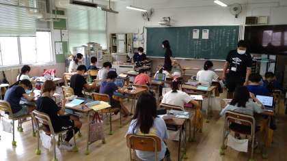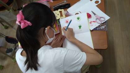 色画用紙11色と白画用紙の12色の中から台紙となるものを1枚選んでいます。画用紙を半分に折りしかけを作ってとび出すようにしたり、色えんぴつ・マジック・ポスカなどで絵をかいたりしています。