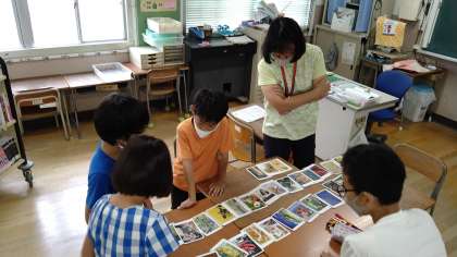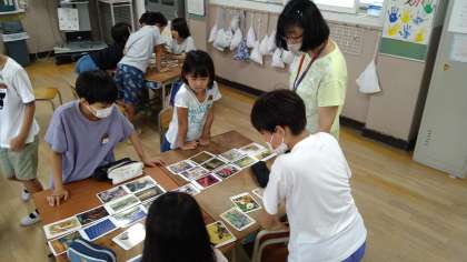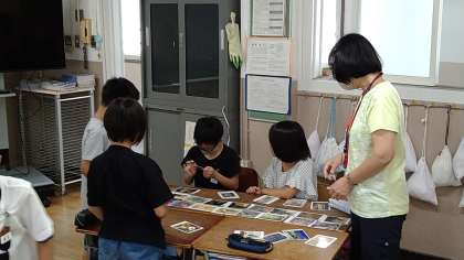 世界的名画から現代アートまでさまざまな時代やジャンルの作品がカードになっています。1セット30枚入っており、赤色の作品、人物画、背景が同色などの共通点を見つけて並べています。