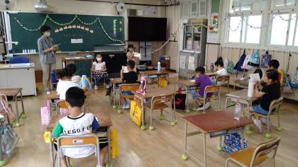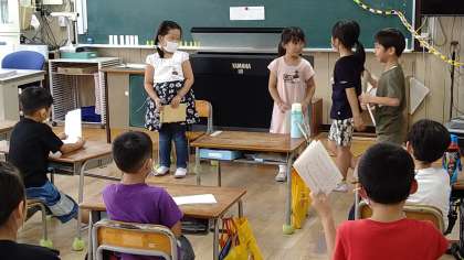 7月が誕生月の児童は1名でした。教室の黒板を折り紙の輪っかをつなげた飾りをはりつけて雰囲気を出しています。担任の詩の朗読、誕生月の児童への質問などをしています。詩は、季節や誕生月の子どもたちを想像して選んでいます。