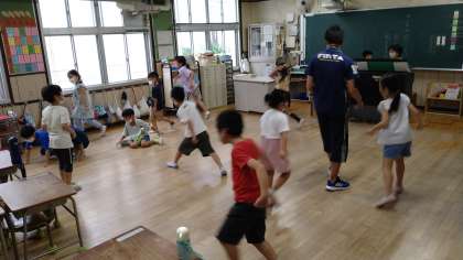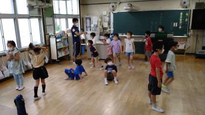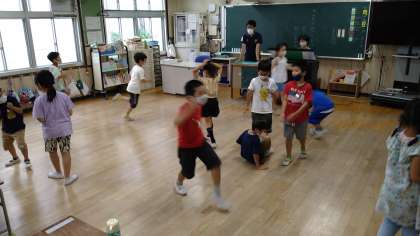 ストップゲームを楽しんでいます。音楽が流れている間は動き曲が止まると動きを止めるゲームです。