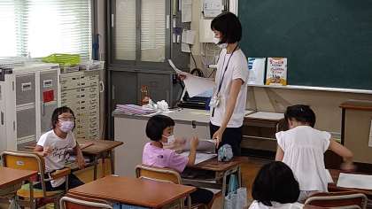 絵日記の書き方を説明しています。夏休み明けの教室掲示にすることを伝え、ていねいに仕上げるように話をしています。