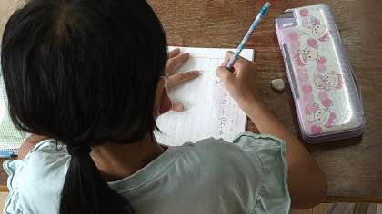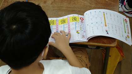 国語の漢字ドリルや練習用ノートを配っています。さっそく新しいドリルを開いてページをめくっています。