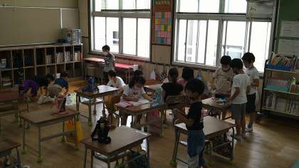 この時間は教室で過ごす休み時間になっています。すごろくやトランプ、折り紙を使っての紙飛行機作り自由帳でのお絵かきなどをしています。