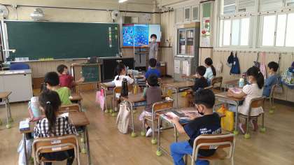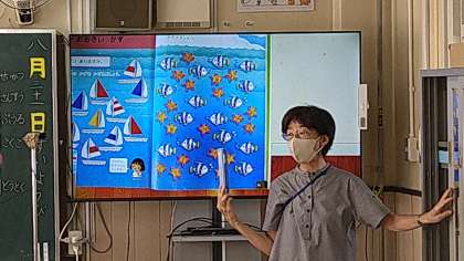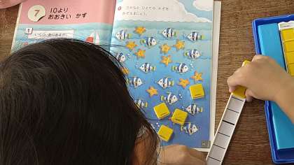ブロックを使っています。数える対象物が2つあるので、間違えないように置いて正確に数えています。