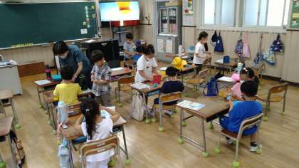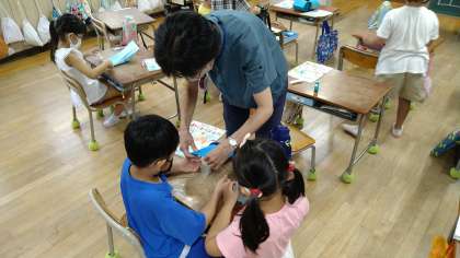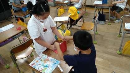 色画用紙で紙工作をしています。片手を親指とその他の指の2つに分けて入れ、「開いて、閉じる」をすることでパクパクと開閉する大きな口を作っています。