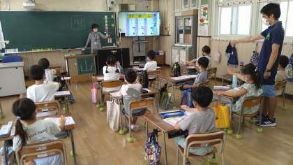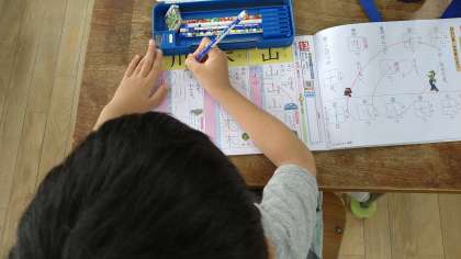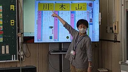 今日の新出漢字は「川」です。3本の縦線の長さや曲げ方、漢字の成り立ちを説明しながら学習を進めています。