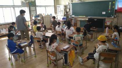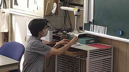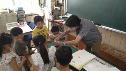 使ったアサガオの花は紫色です。花に少量の水を加えて手で花を潰して色水にしています。色水を作ったあと、和紙を染めています。