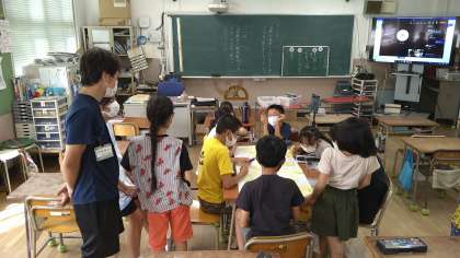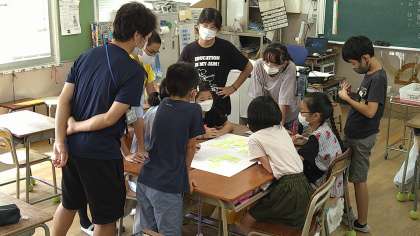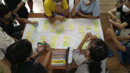 2つのテーマで話し合っています。テーマは、子どもたちから提案されたものです。話し合いたい方のテーマの話し合いに参加し、もう1つのテーマについては、話し合いの様子を観察しています。