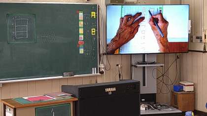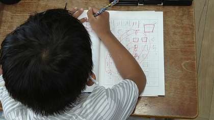 今回学習している新出漢字は「目」です。8ますノートに練習をしています。すべての子どもたちのノートに事前に担任が赤字で書いてなぞる練習をしています。