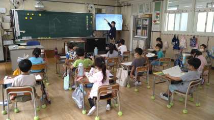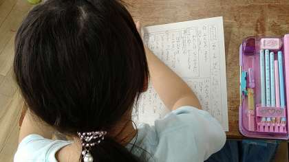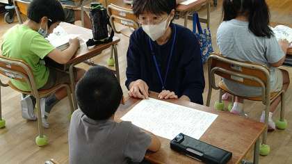 一枚のテストを「はい、始めましょう。」で、自分自身の力だけで解いていくことはまだ難しいので、1問ずつ取り組んでいます。みんなで問題を読み、指導者が説明を加えてから答えを書いています。