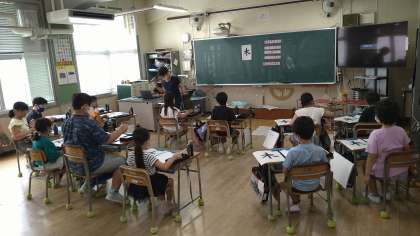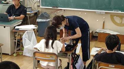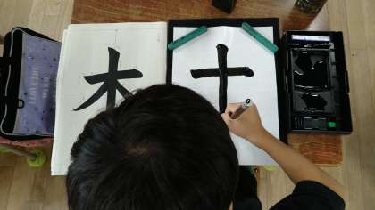 前の時間は、右はらいと左はらいを練習しています。今回は文字の大きさやバランスに気をつけて書いています。5から6枚書いて、納得のいった1枚にサインペンで名前を書いて提出しています。