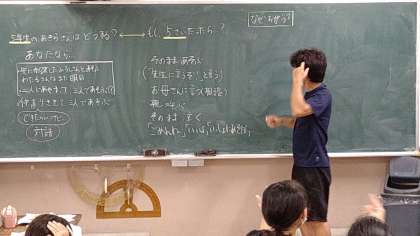 遊ぶ約束をダブルブッキングしてしまった場面を提示し、5年生の今と5歳の頃を比較しています。脳(心)の成長により、感情のコントロール・思考力・社会性などが高まってきたことを引き出して学習を進めています。