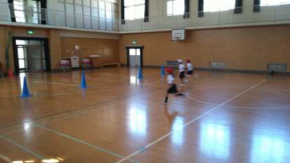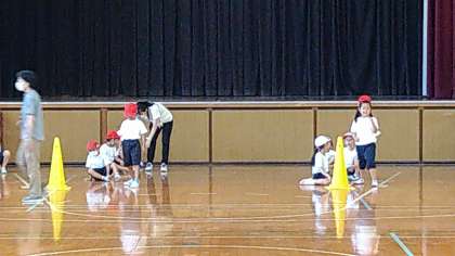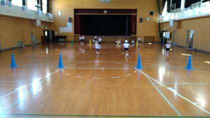 小学校に入学して初めての運動会になります。目印となるコーンを置いて目標にめがけて走る練習をしています。