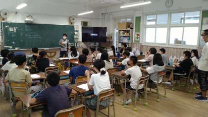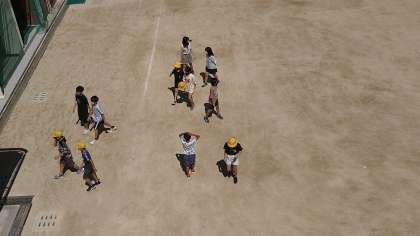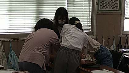 どうすればメジャーを屋上から垂らすことなく求めることができるかを考えています。運動場へ出て考える子どもたちがたくさんいましたが、数名の子どもたちは教室で相談しています。