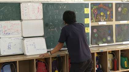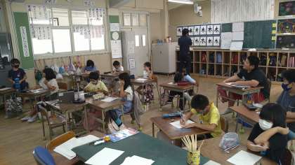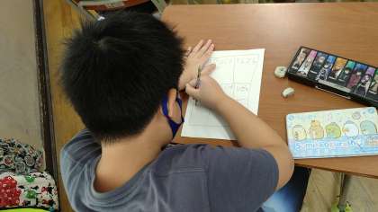 NGワードビンゴとアニメ番組ビンゴをしています。縦3マス・横3マスの枠に書き込んでいます。9つのマスを埋めるのに苦労している児童もいますが、近くの席の人が教えています。
