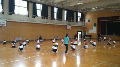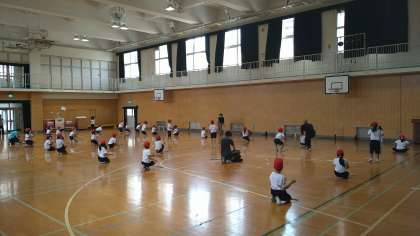 練習の1時間目は、演技の練習をしています。低学年(1・2年)の演目は「アイヌのおどり」です。船を漕ぐ動作やキタキツネの動作を練習しています。