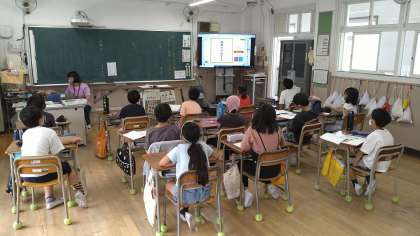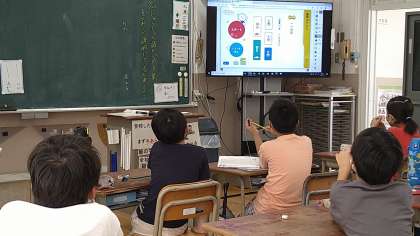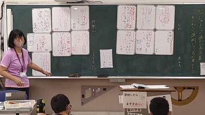 ミニホワイトボードに1人ずつ文作りをし、書いた文を黒板に貼り、それぞれの文を確認しています。残りの時間は、テストに向けた漢字(書き方・読み方)の復習をしています。