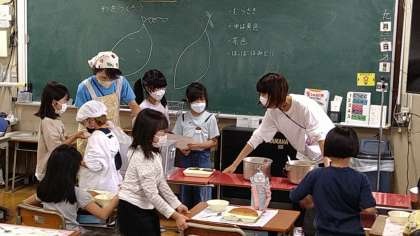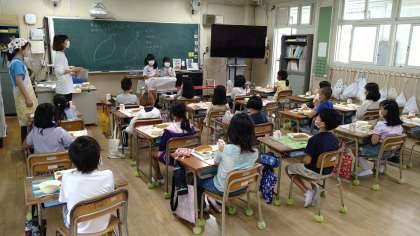 給食の準備は、当番の子どもたちがそれぞれの役割ごとに責任をもっておこなっています。「いただきます。」は日直が前に出て言っています。食べ始める前に「少なめと減らし」、食べ始めると「増やし」をしています。