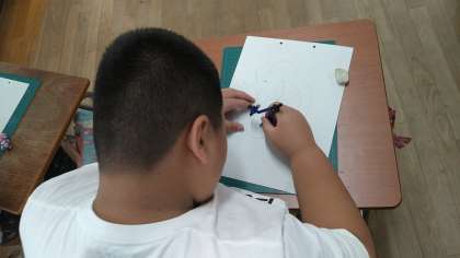 今回の学習で2回目となります。前回は円を組み合わせてクマをかきました。今回は花をかいたあと、半径の長さを変えずに模様になるようにコンパスを操作しています。