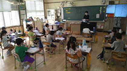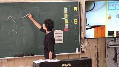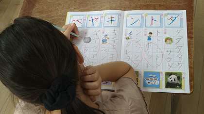 漢字ドリルとたのしいおけいこ「カタカナ」、国語ノートを使って練習しています。指導者の話をよく聞いて間違えやすいところ「もう少しななめ下まで」などと答えています。