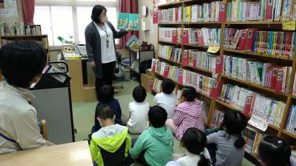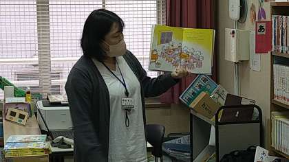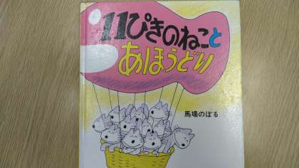 毎週金曜日は、学校司書の松下さんにお越しいただいています。松下しんに「あほうどりと11ぴきのねこ」を読み聞かせをしてもらっています。あほうどりを食べようと思った11ぴきのねこたちがあほうどりのためにコロッケを作るはめになるお話です。