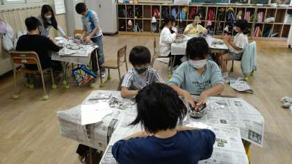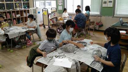 新聞紙を使ってお面の原型ができた児童から和紙を貼っていっています。和紙も新聞紙と同じように細かくちぎってから洗濯のりで貼っていっています。