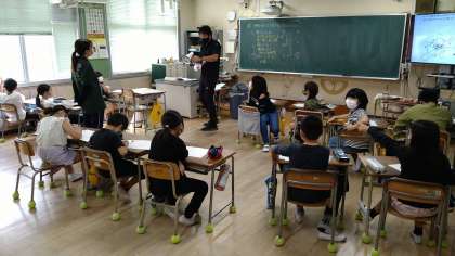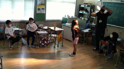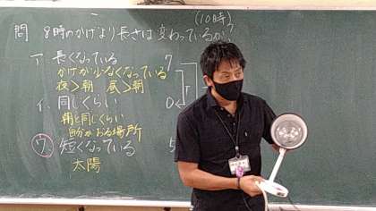 「10時の影は、8時の影と長さが変わっているか?」という問題に取り組んでいます。教室でライトを太陽に見立てて実験し、影のできる方向や長さを調べています。