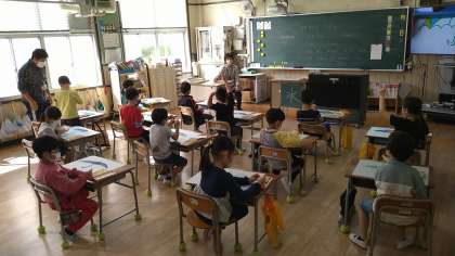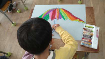 「大きなかさをさしたら・・・」という題名で絵をかいています。大きな傘を持っている自分をかいています。傘の下には、たくさんの動物や虫たちがいます。パスを使って制作しています。