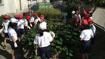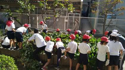 おおよそ自分が苗を植えたところに行き、いも掘りをしています。どんどん掘り始める子どもたちもいれば、さまざまな生き物を怖がってなかなか掘り始められない子どもたちがいます。