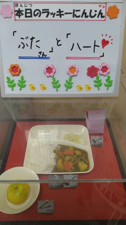 今日は「ポークカレーライス」が提供されています。カレーのトロ味は米粉出だしています。カレーの具材のにんじんはラッキーにんじん(ぶたとハート)も入っています。